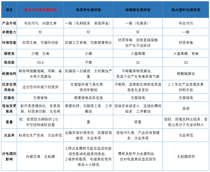 高分子(zǐ)合金電纜橋架是在傳統金屬電纜(lǎn)橋架的基礎結(jié)構上進行改造升級,改(gǎi)變(biàn)金屬電纜橋架單層結構(gòu),結合塑料(liào)擠出工藝,采用PVC、ABS、PS等高分子樹脂(zhī)及多種精細化(huà)工助劑,經過塑料改性,應用特製設備、模具擠製製成的一種兼具傳統金屬橋架載荷能(néng)力及塑料製品絕(jué)緣阻燃性(xìng)能(néng)、耐腐蝕長(zhǎng)壽命性能的新型電(diàn)纜橋架。高分子合金電纜橋架克服了傳統金屬電纜橋架金(jīn)屬材質的工況缺陷,適用於潮(cháo)濕、腐蝕氣體、靜電、液體、酸堿附著等惡劣環境下的線纜敷設(shè)工程(chéng)。